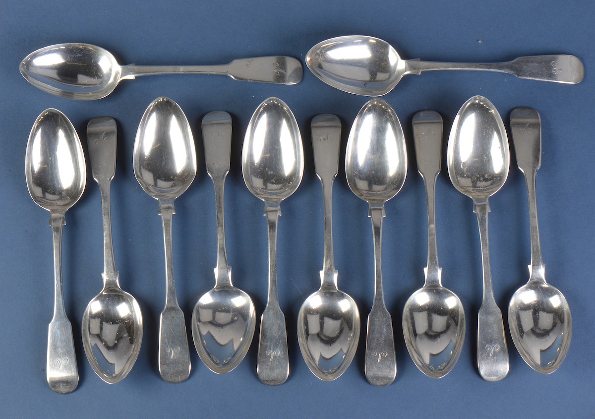 A Set of Nine Fiddle patterned Desert Spoons. Maker: GB. Date Letter Z. Along with Three similar Desert Spoons. Date Letter A. Initial A. Weighing: 368 grams. (12).