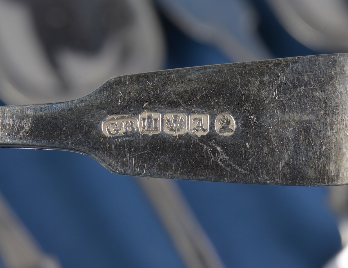 A Set of Nine Fiddle patterned Desert Spoons. Maker: GB. Dat...