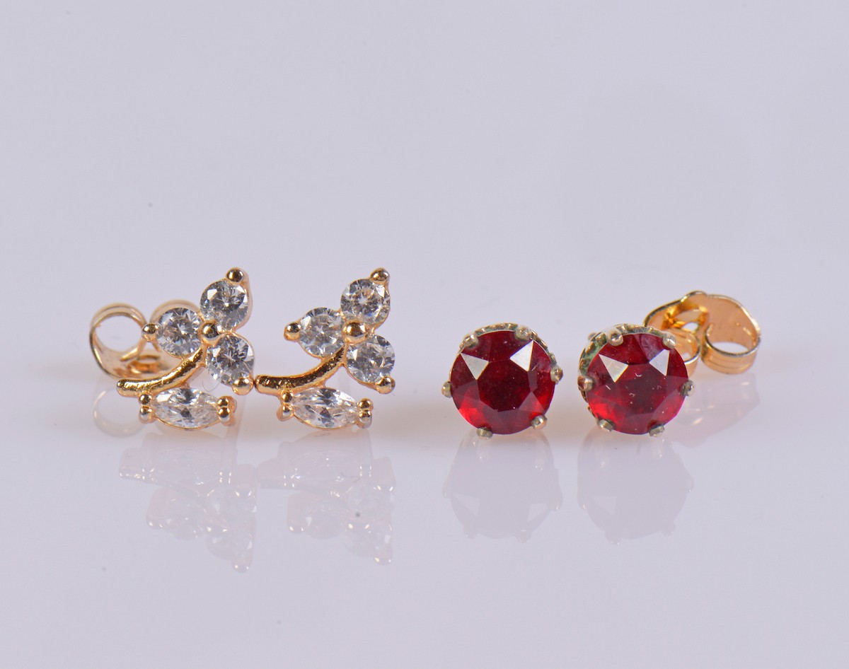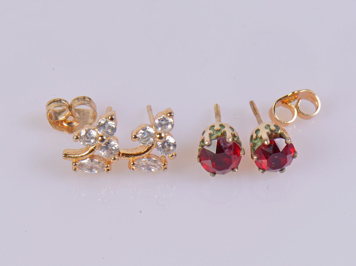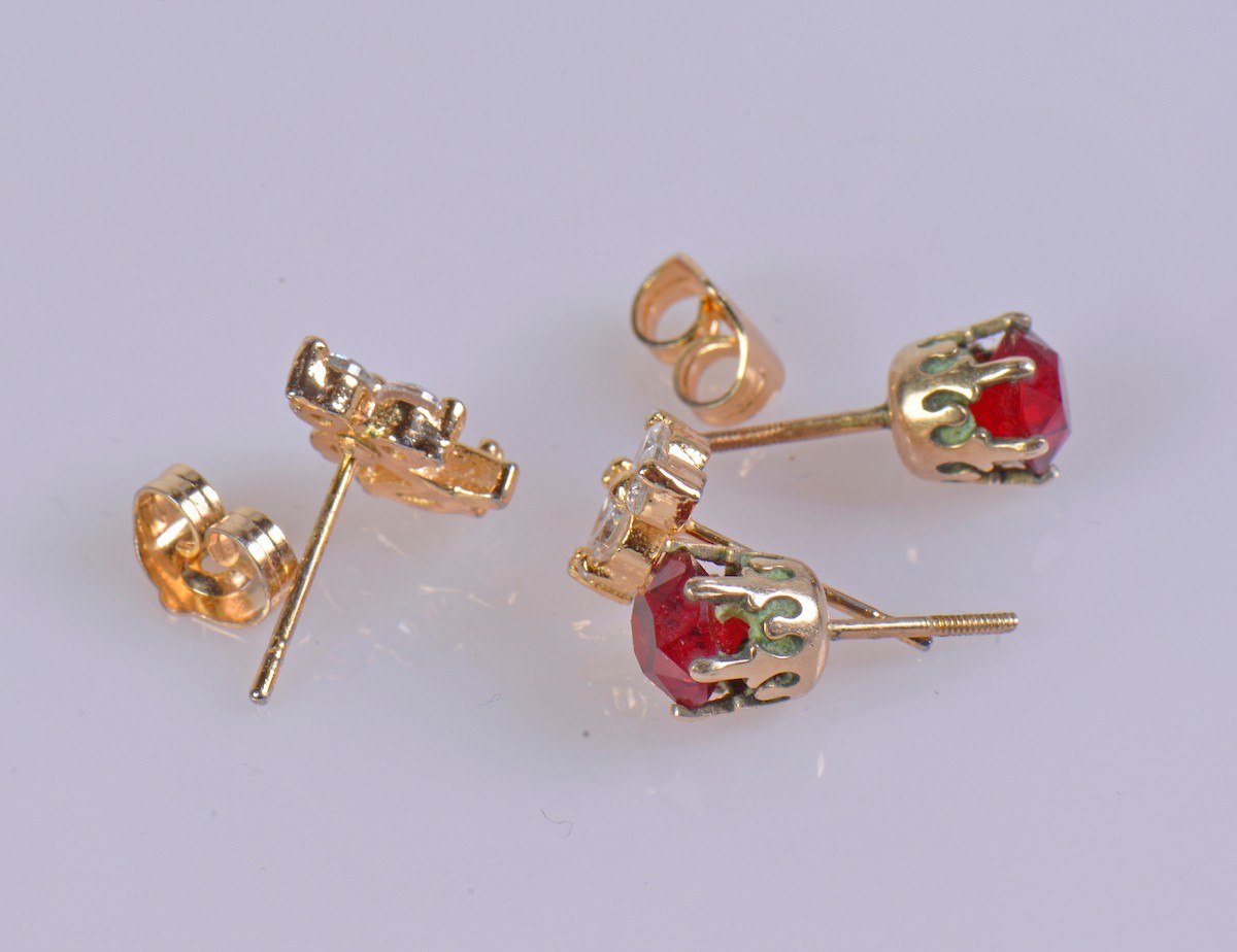 A pair of garnet earrings, possibly set in 9ct gold. Weight approximately 1.2 g. Paired with a pair of paste set earrings.