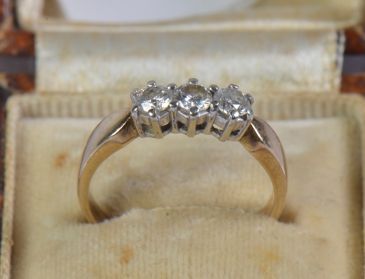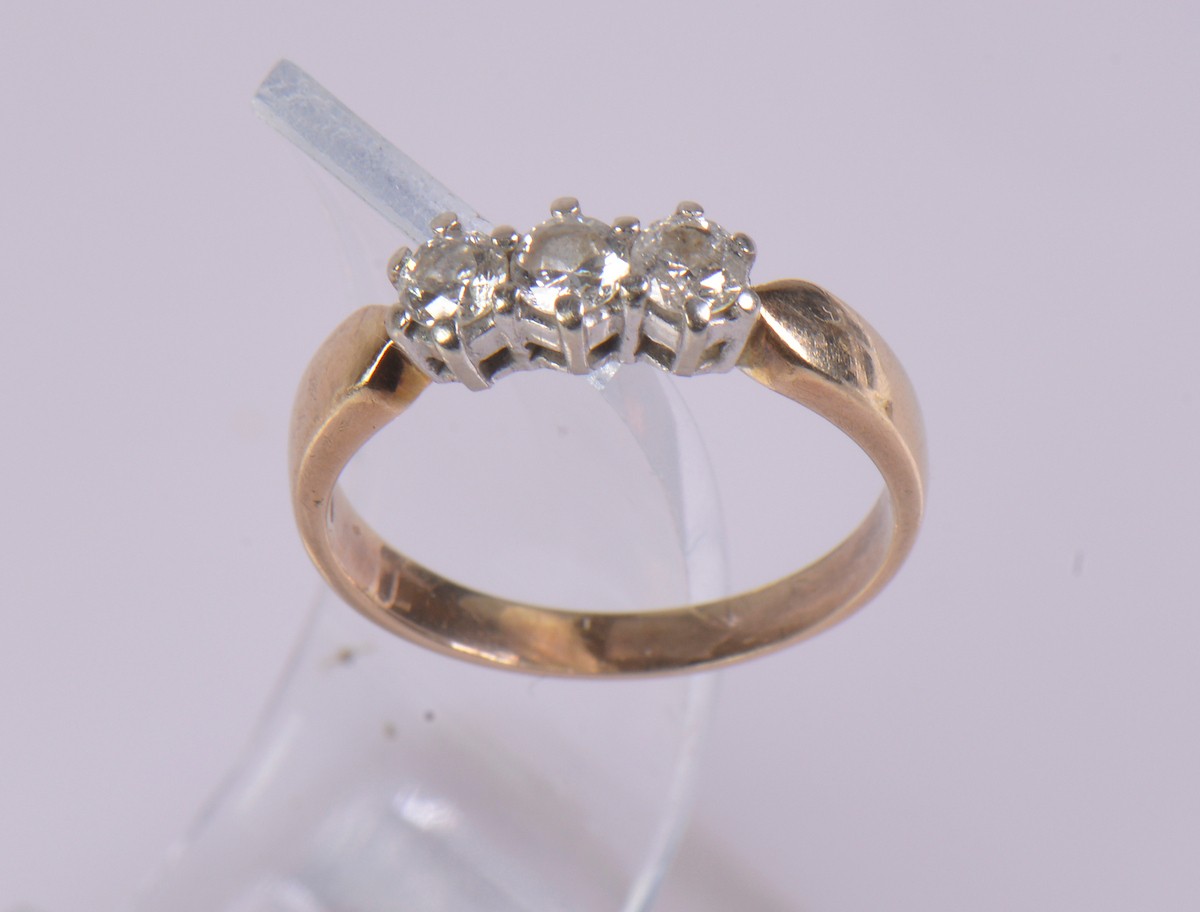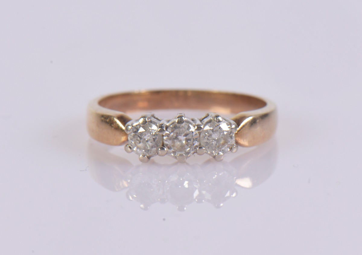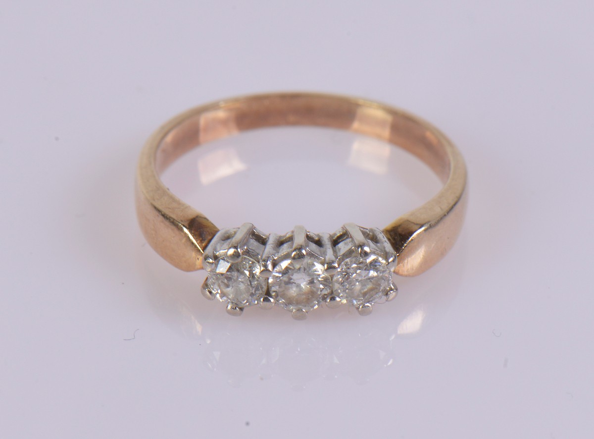 A 9ct gold trilogy ring set with three round brilliant cut diamonds, each approximately 0.20 ct. Weighing around 2.6 g, ring size M.