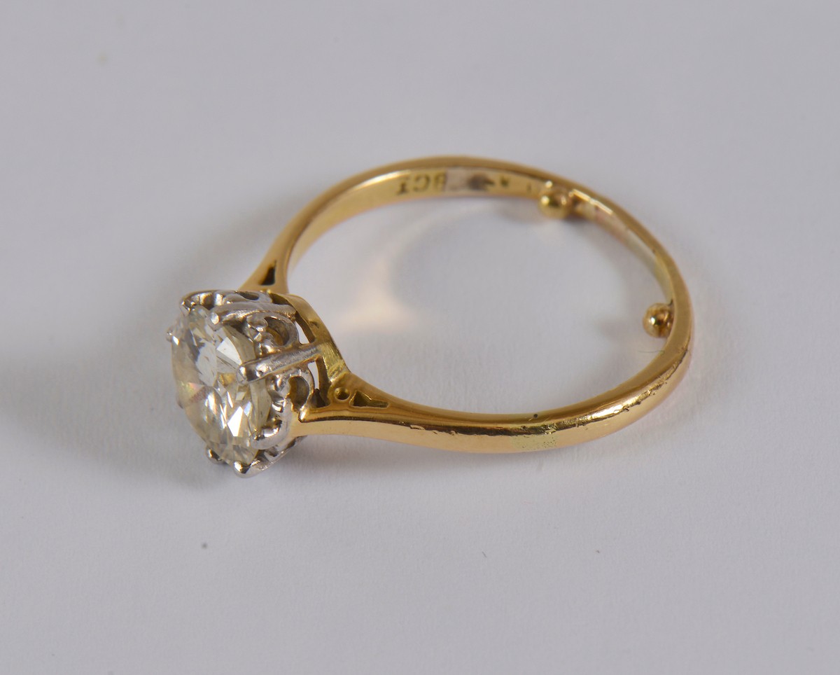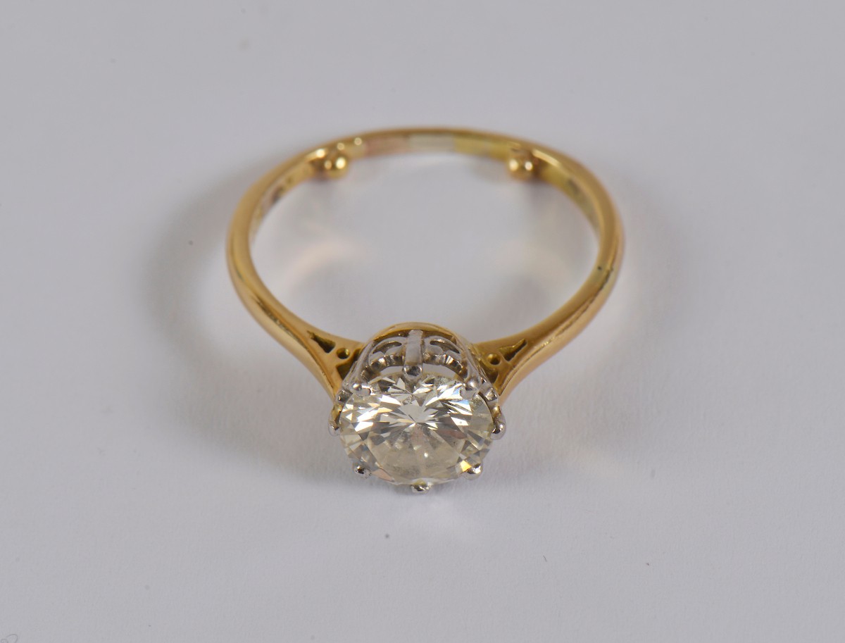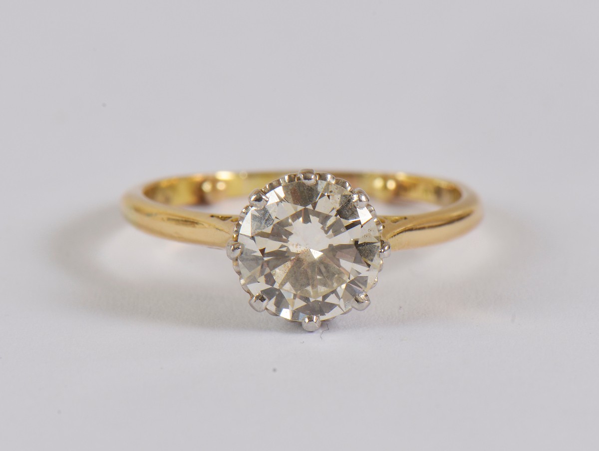 A ladies solitaire diamond ring, set in 18ct gold and featuring a diamond of approximately 1.8ct. Ring size M. Total weight 3.2g.