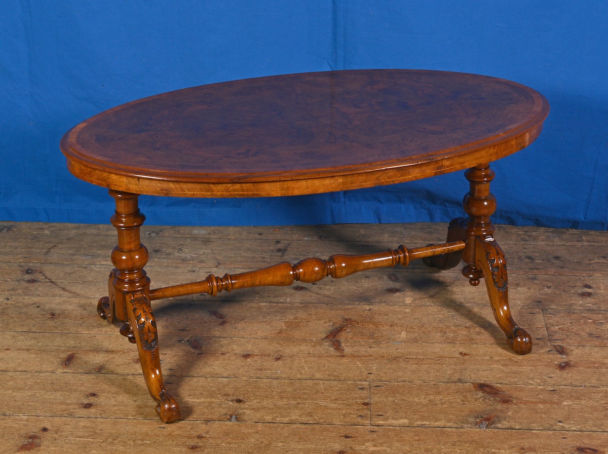 A Victorian Walnut Oval Topped Loo Table with inlaid & Banding resting n turned shaped legs with Cross Stretcher. Measuring: 102cms across x 58cms wide x 49cms high.