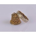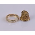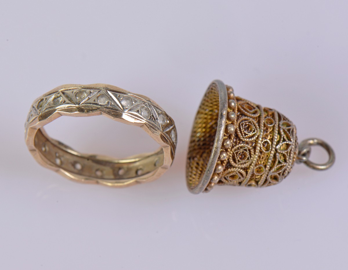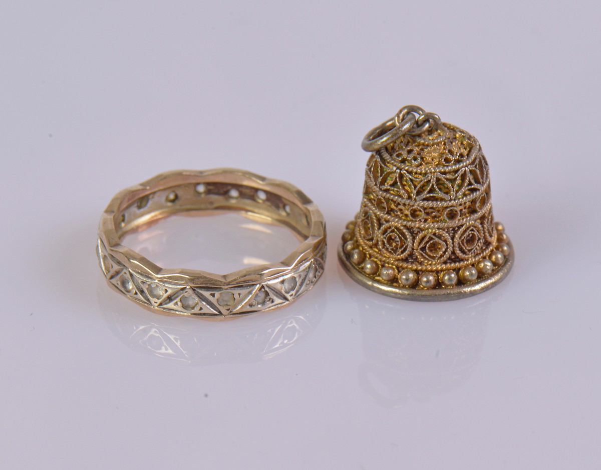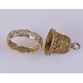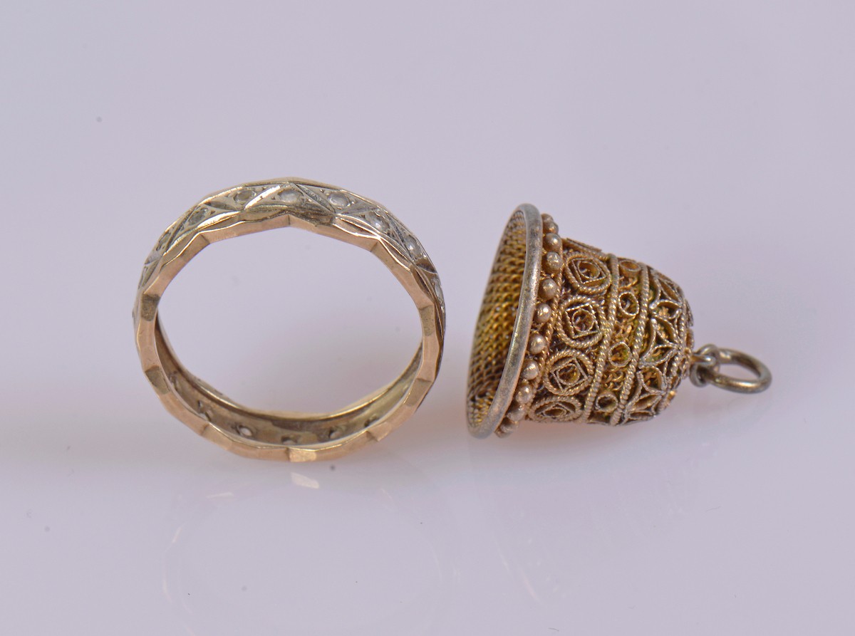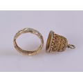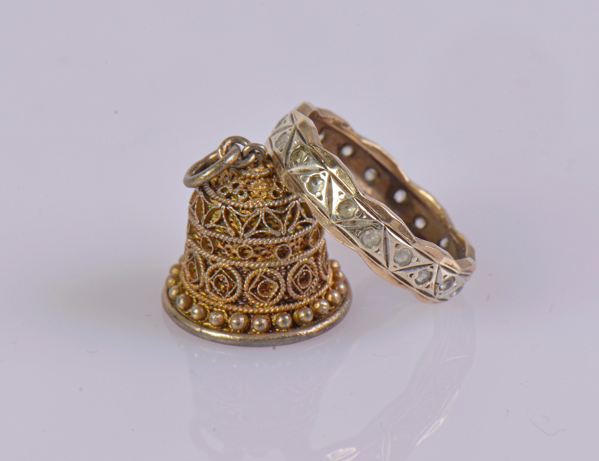 A 9ct hallmarked engraved band featuring geometric detailing and set with paste stones. Weight approximately 2.3 g. Ring size L. Paired with a gold coloured thimble.