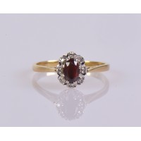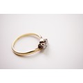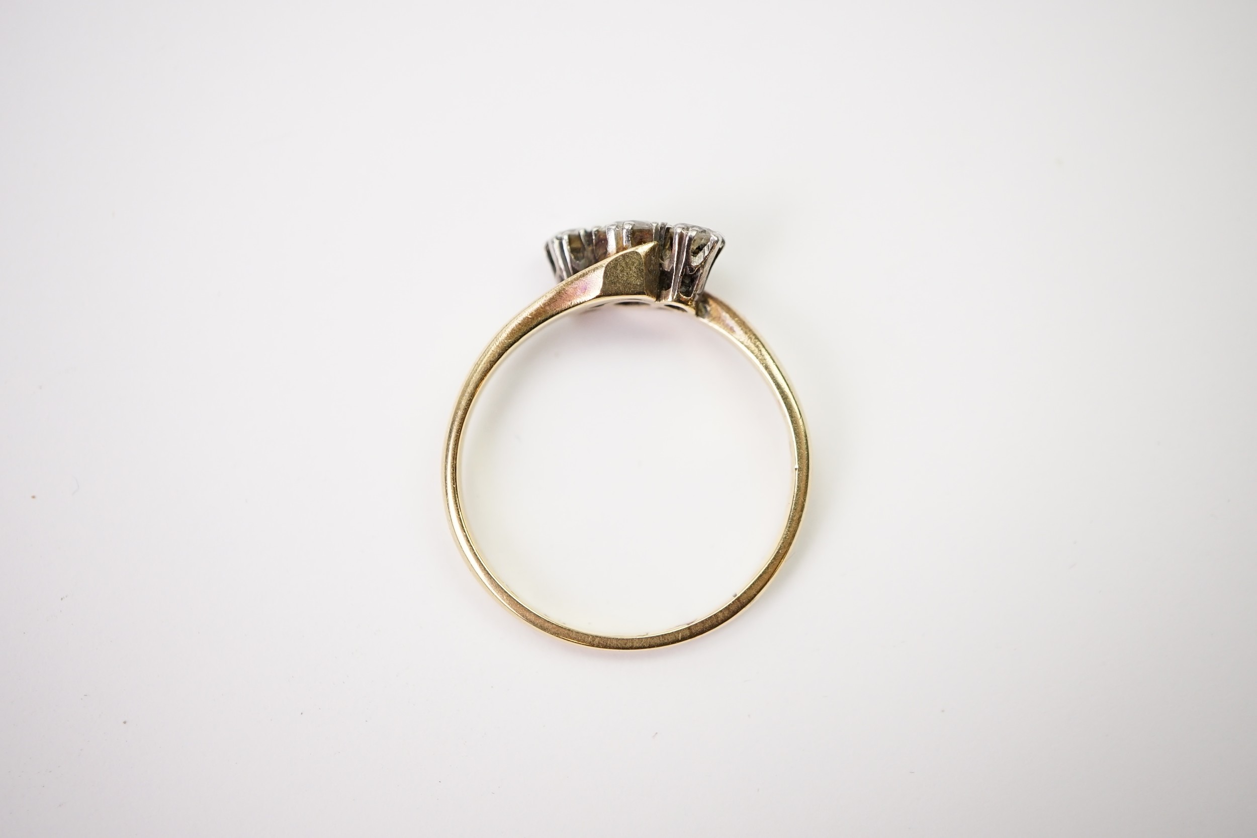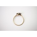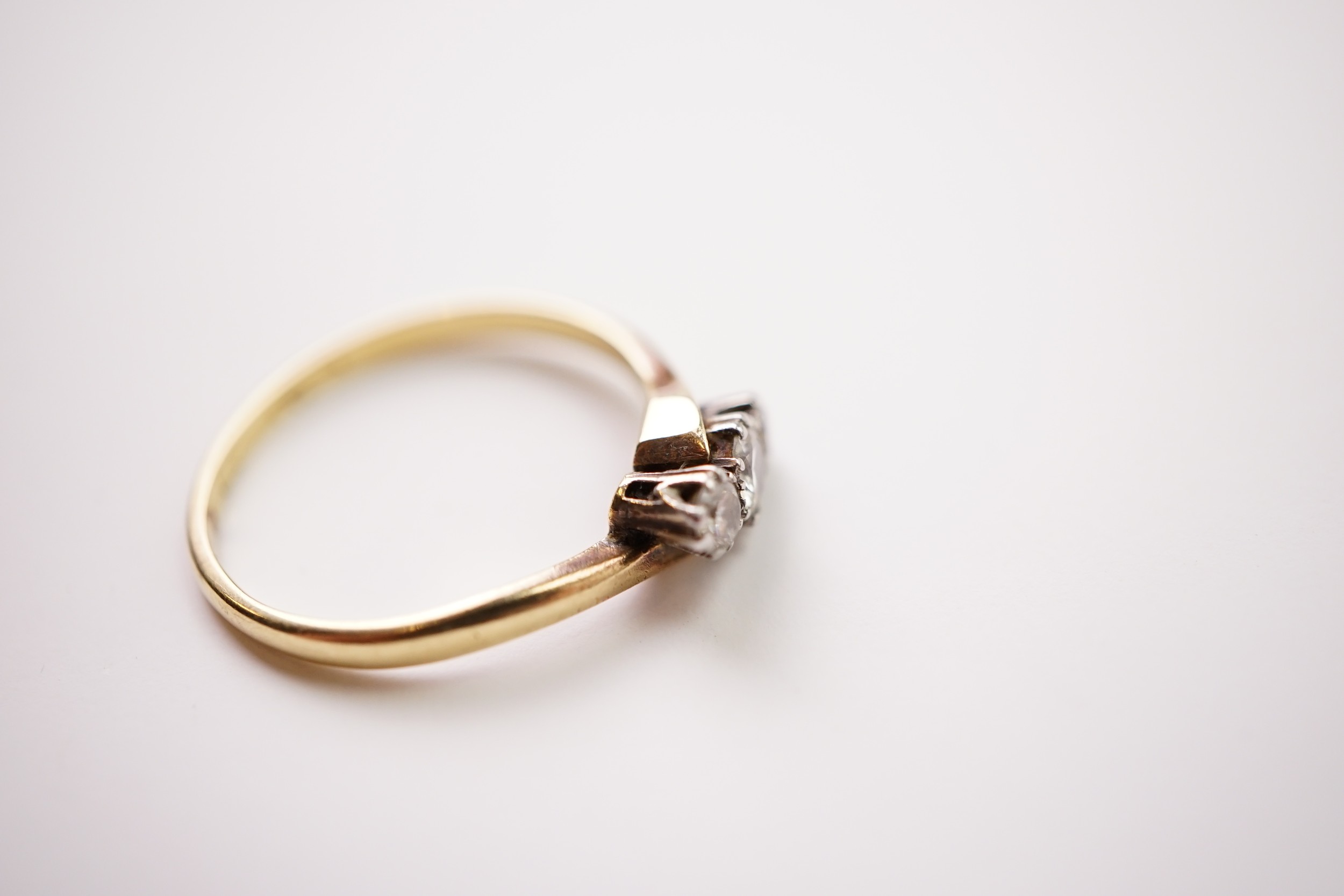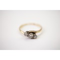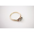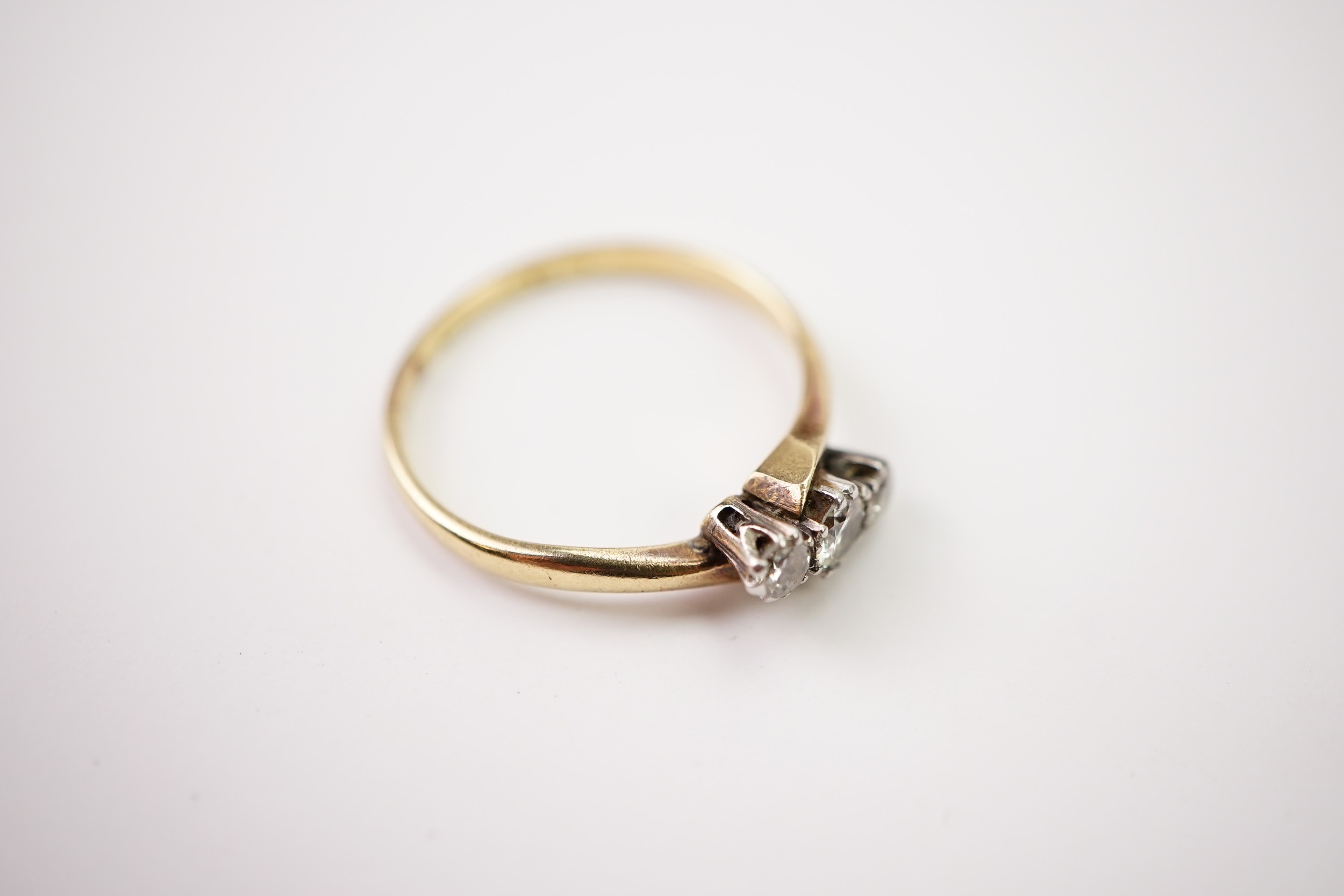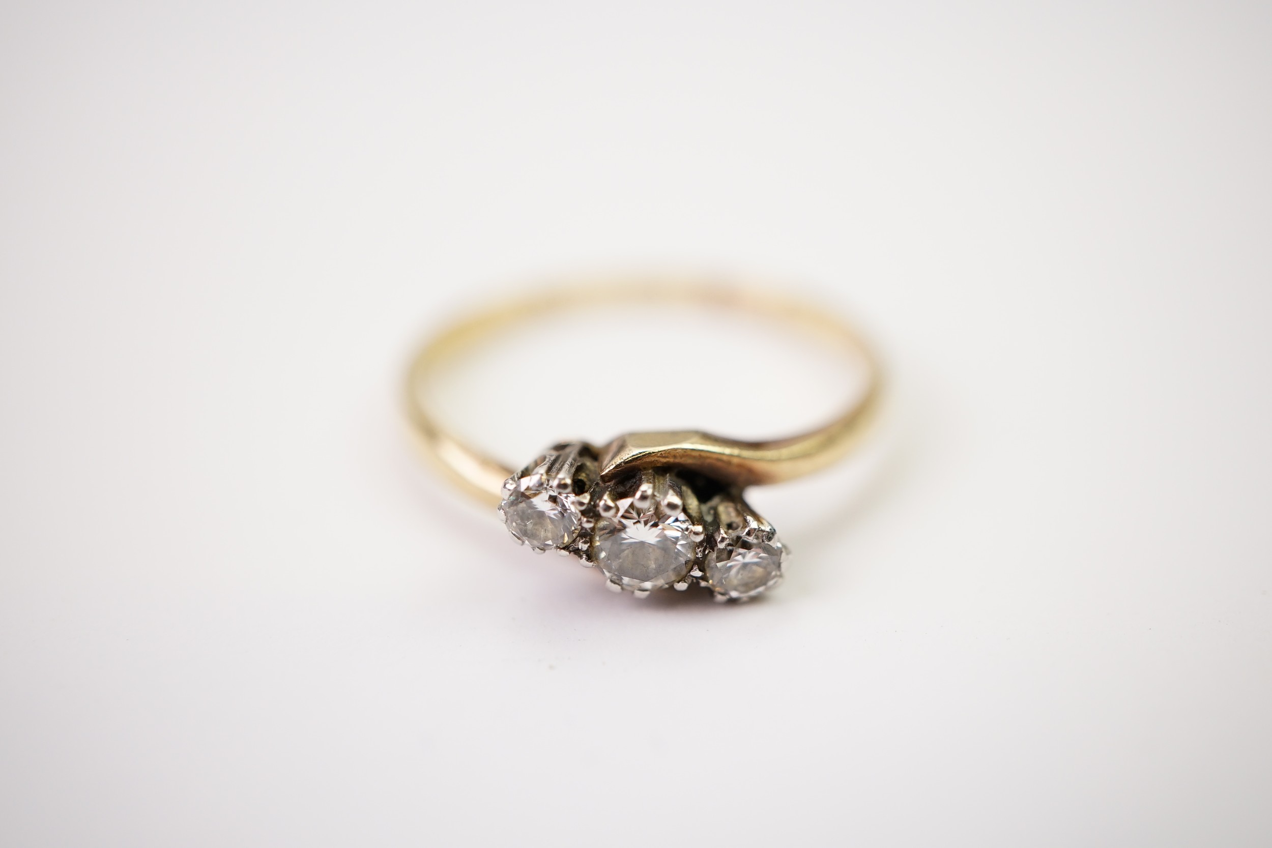 A gold and diamond trilogy ring, set with a central diamond of approximately 0.20ct and two surrounding diamonds of around 0.09ct each. Weight approximately 2.5g. Ring size N/O. Hallmark rubbed.