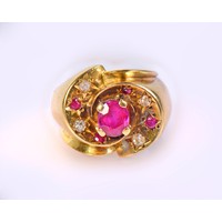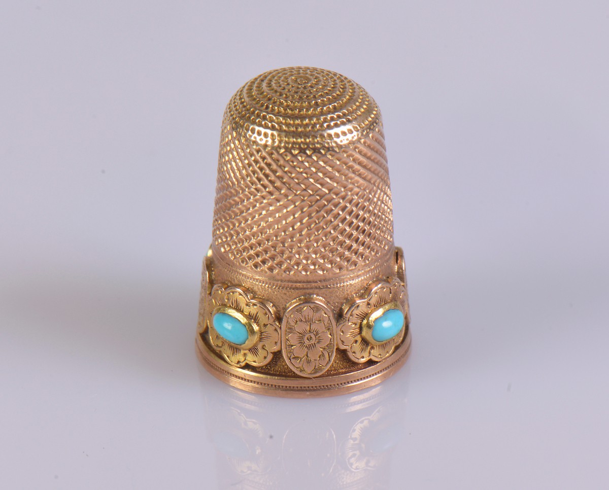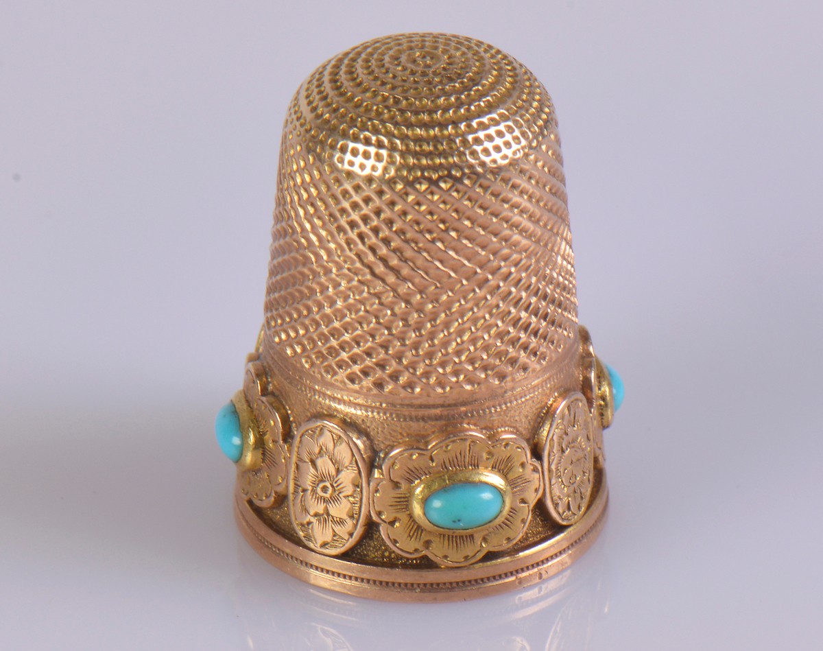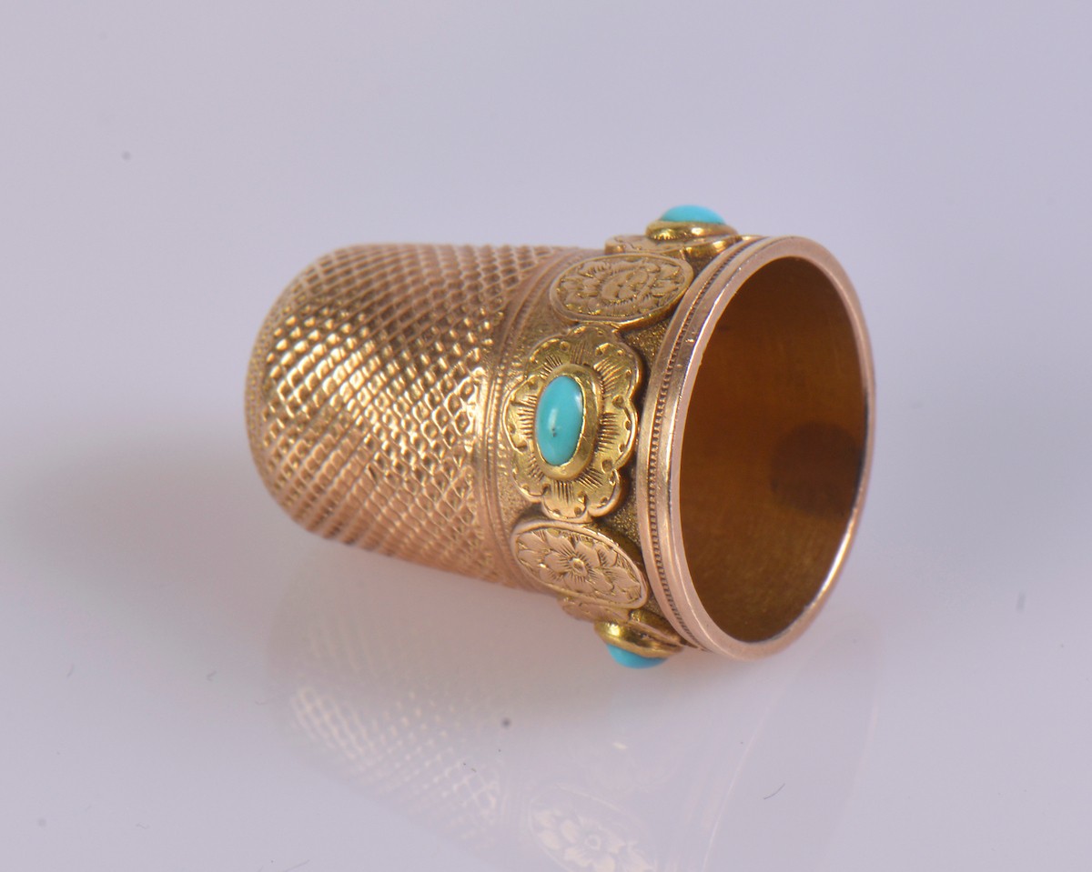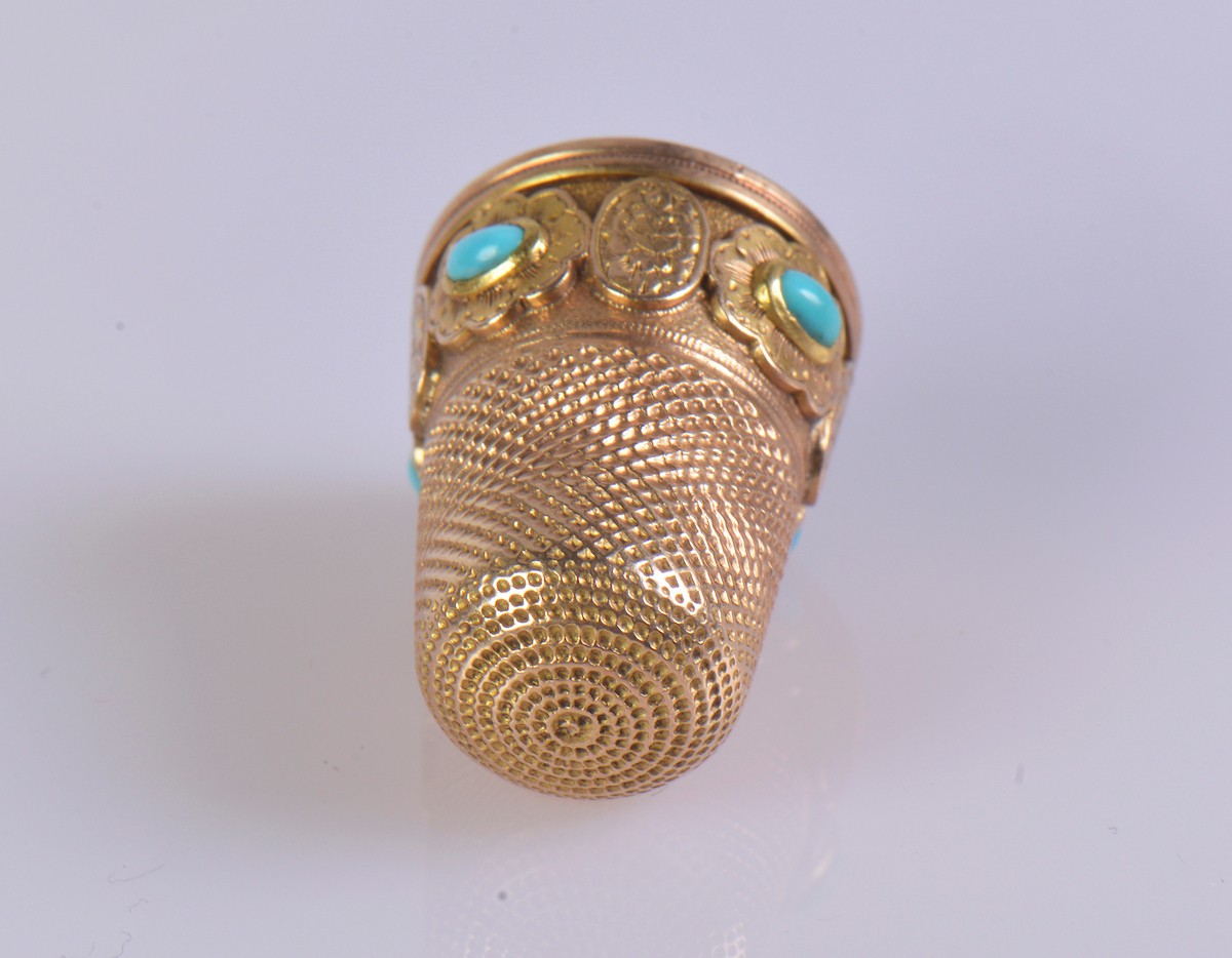 A gold thimble with turquoise cabochons and a monogrammed sh...