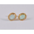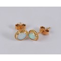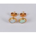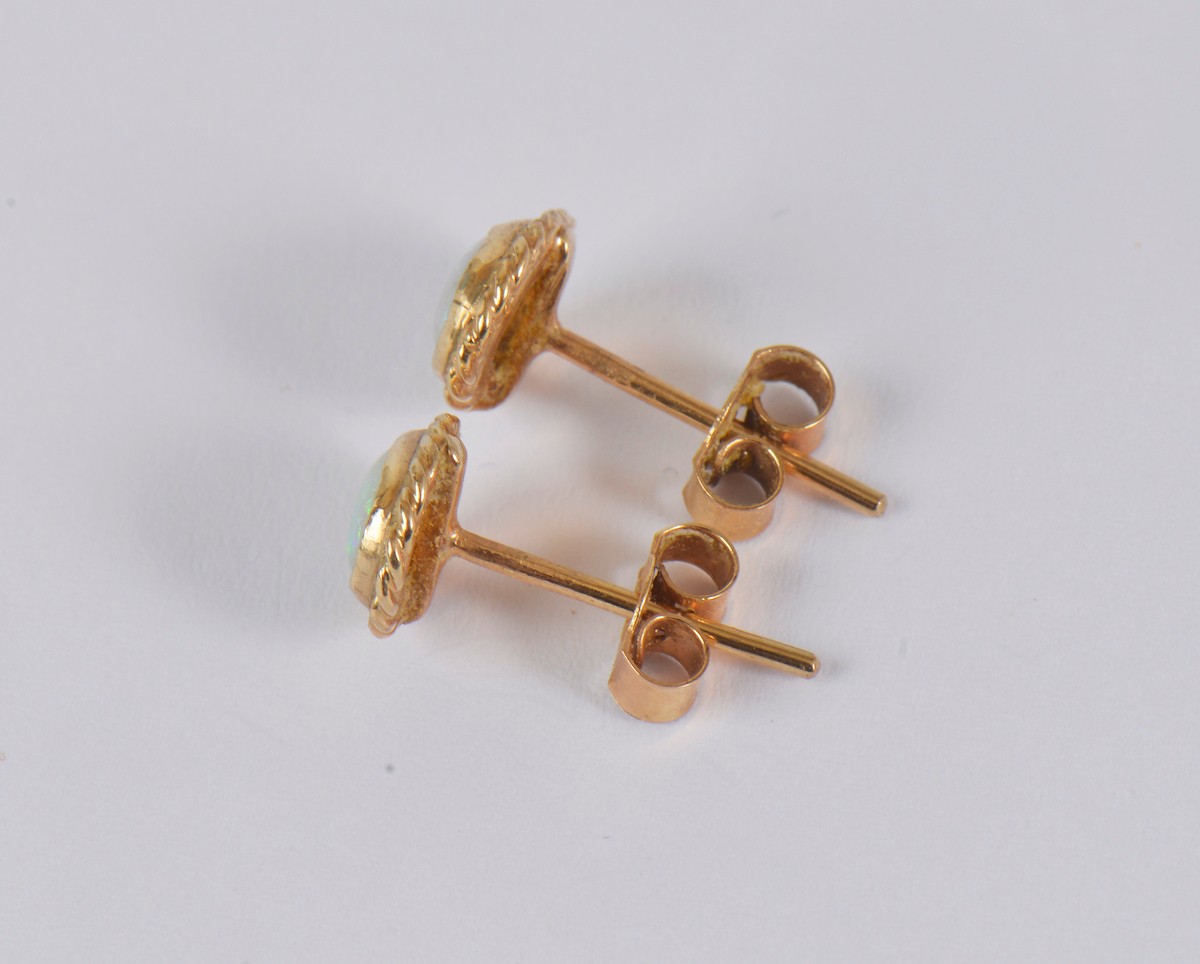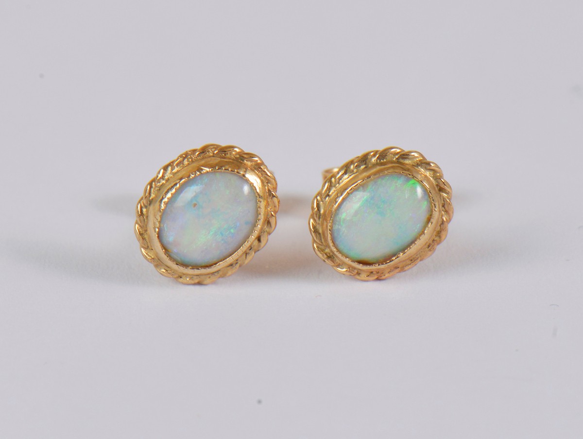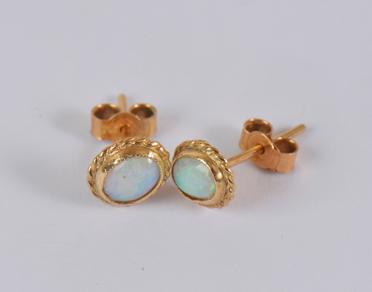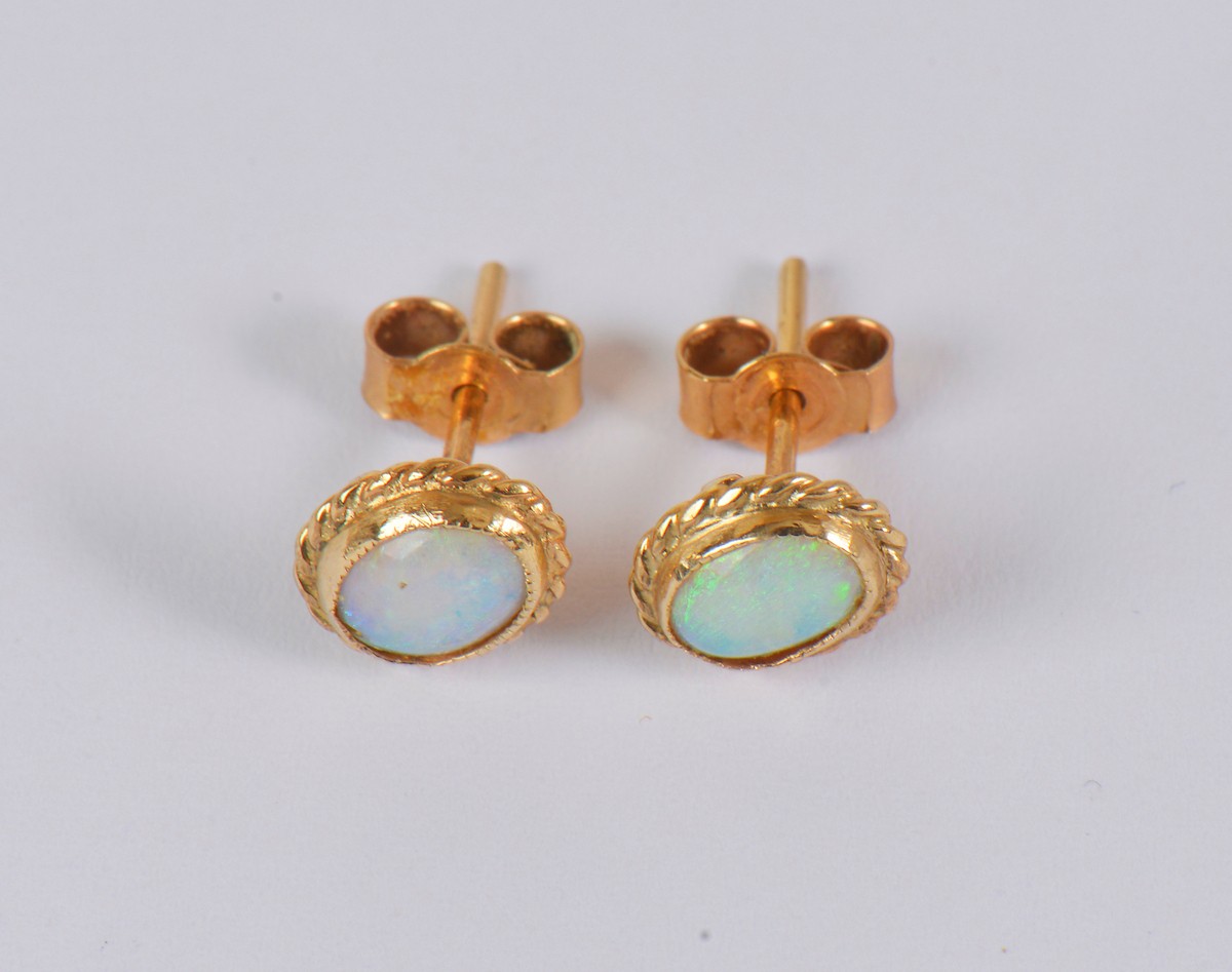 A pair of oval opal set earrings, each featuring fiery opals in an unmarked setting, complete with 9ct gold earring backs. Total weight: 1.3g.