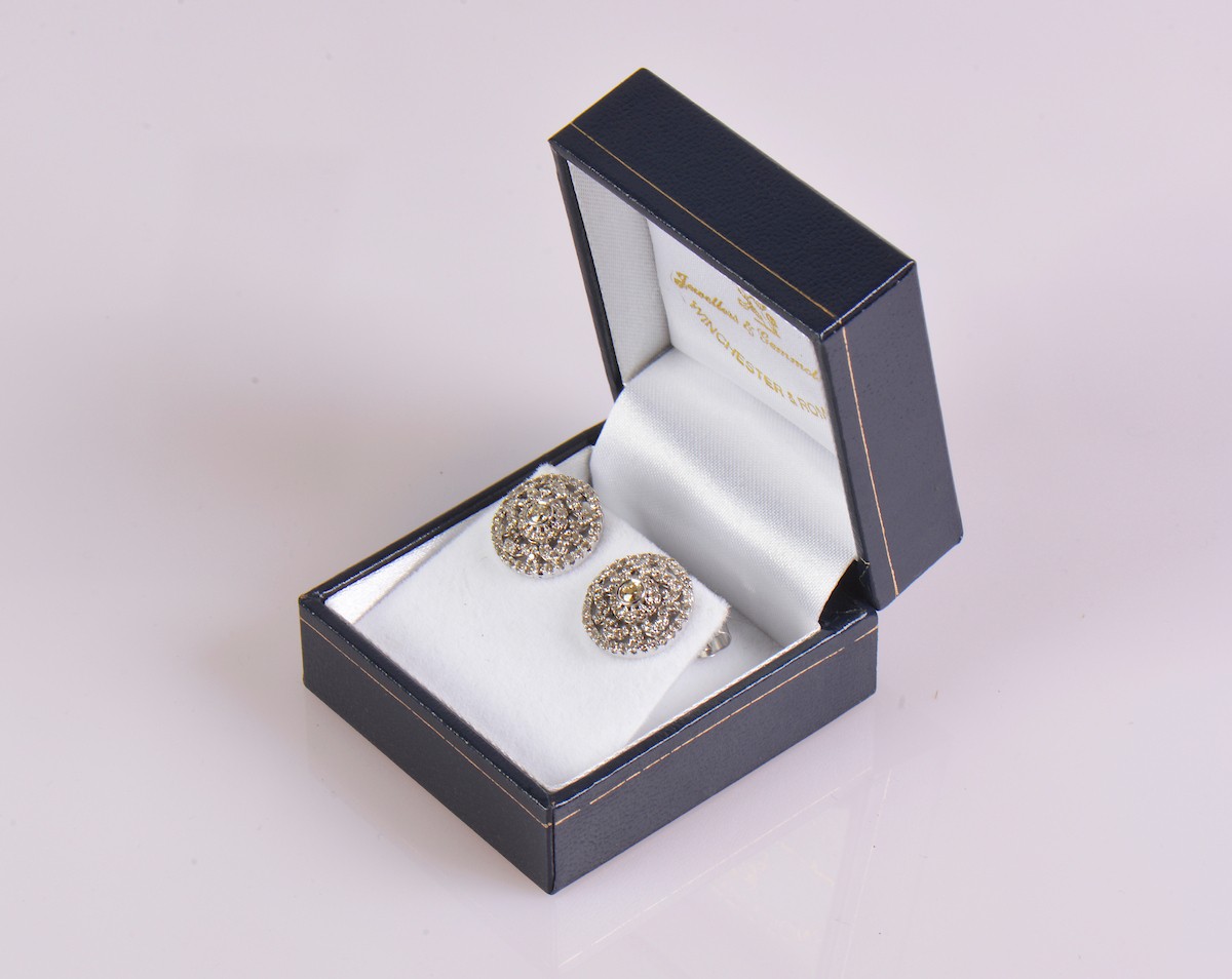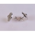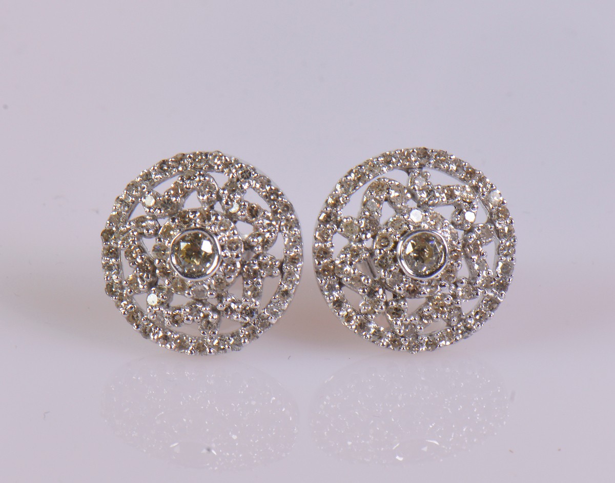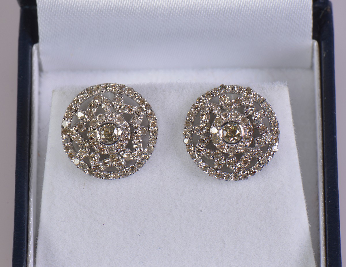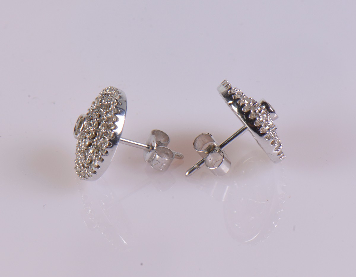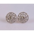 A pair of 9ct gold diamond earrings, featuring a central diamond of approximately 0.12 ct surrounded by around 60 smaller diamonds. Total weight, including backs, approximately 4.9 g.