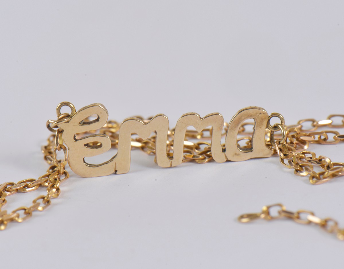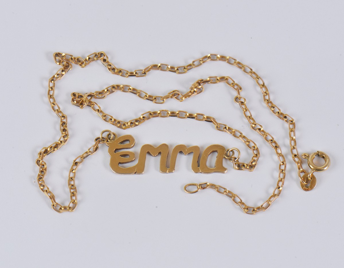 A 9ct gold necklace, finished with an “Emma” name pendant. W...