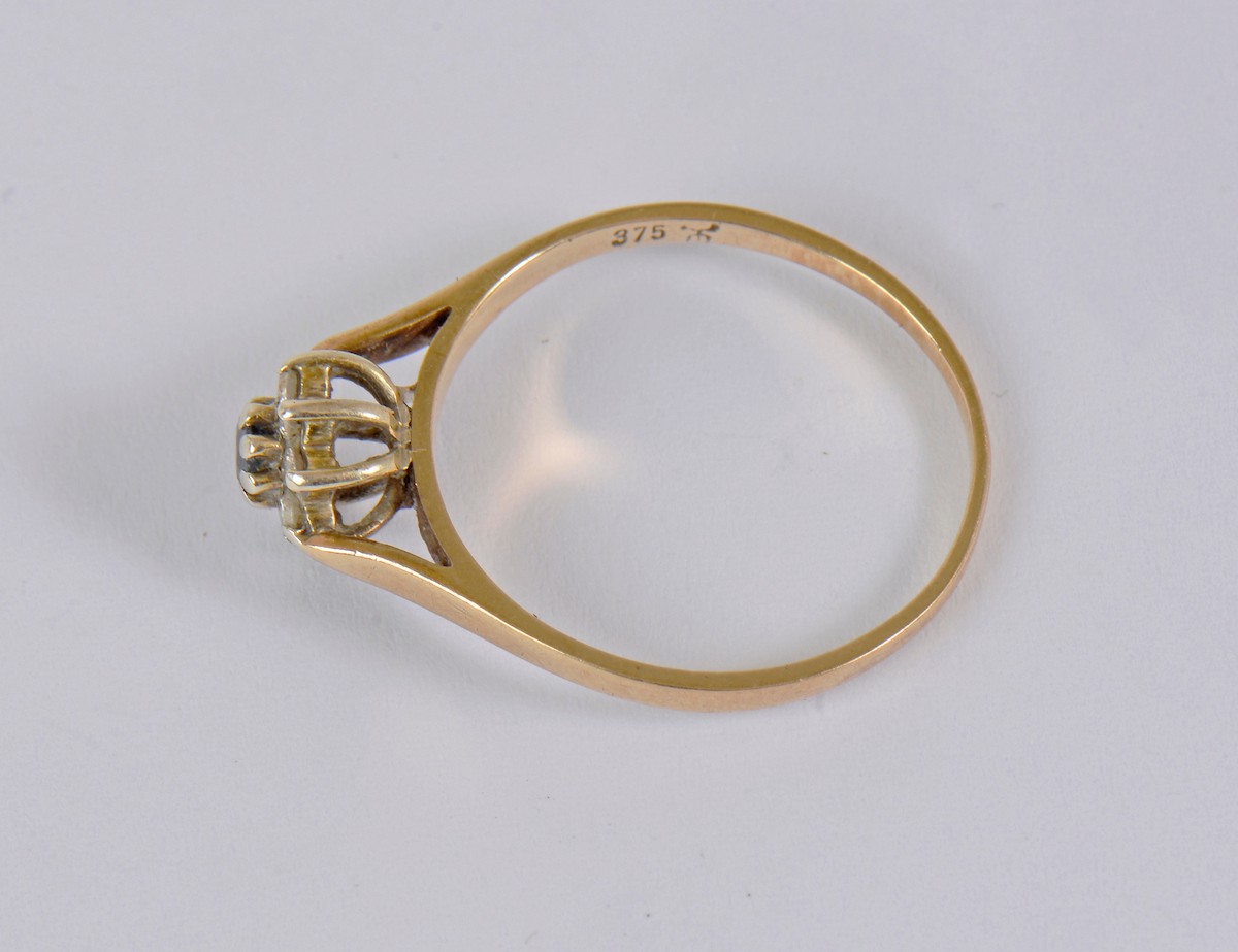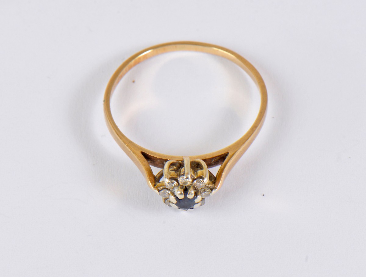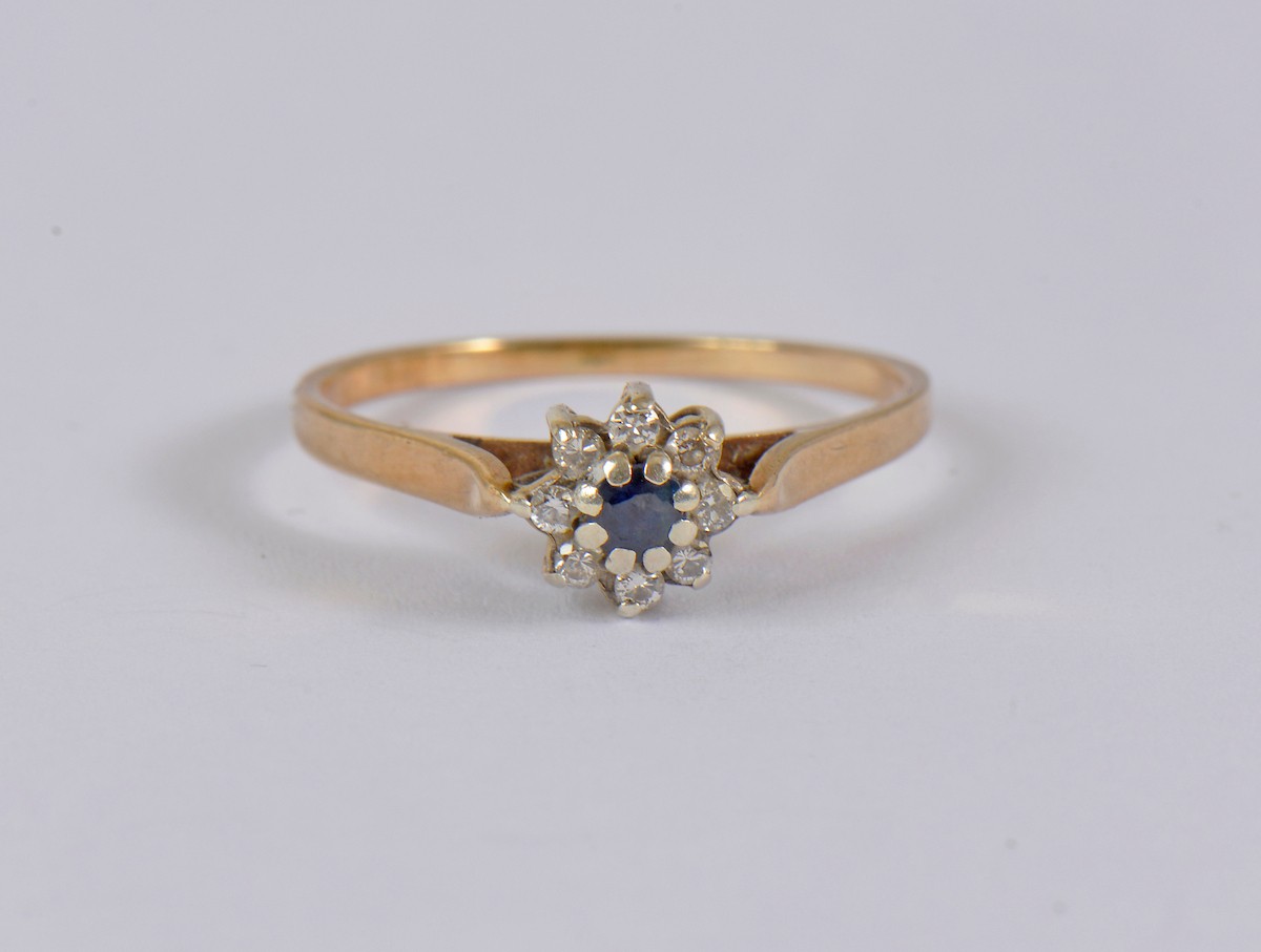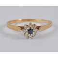 A ladies sapphire and diamond cluster ring, set in 9ct gold. Weight 1.6g. Ring size N/O.
