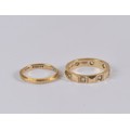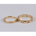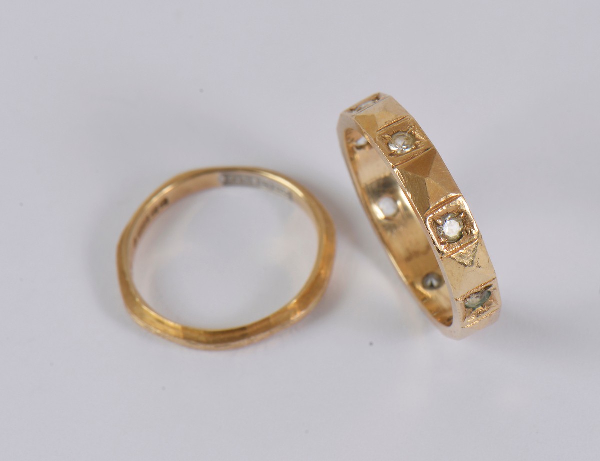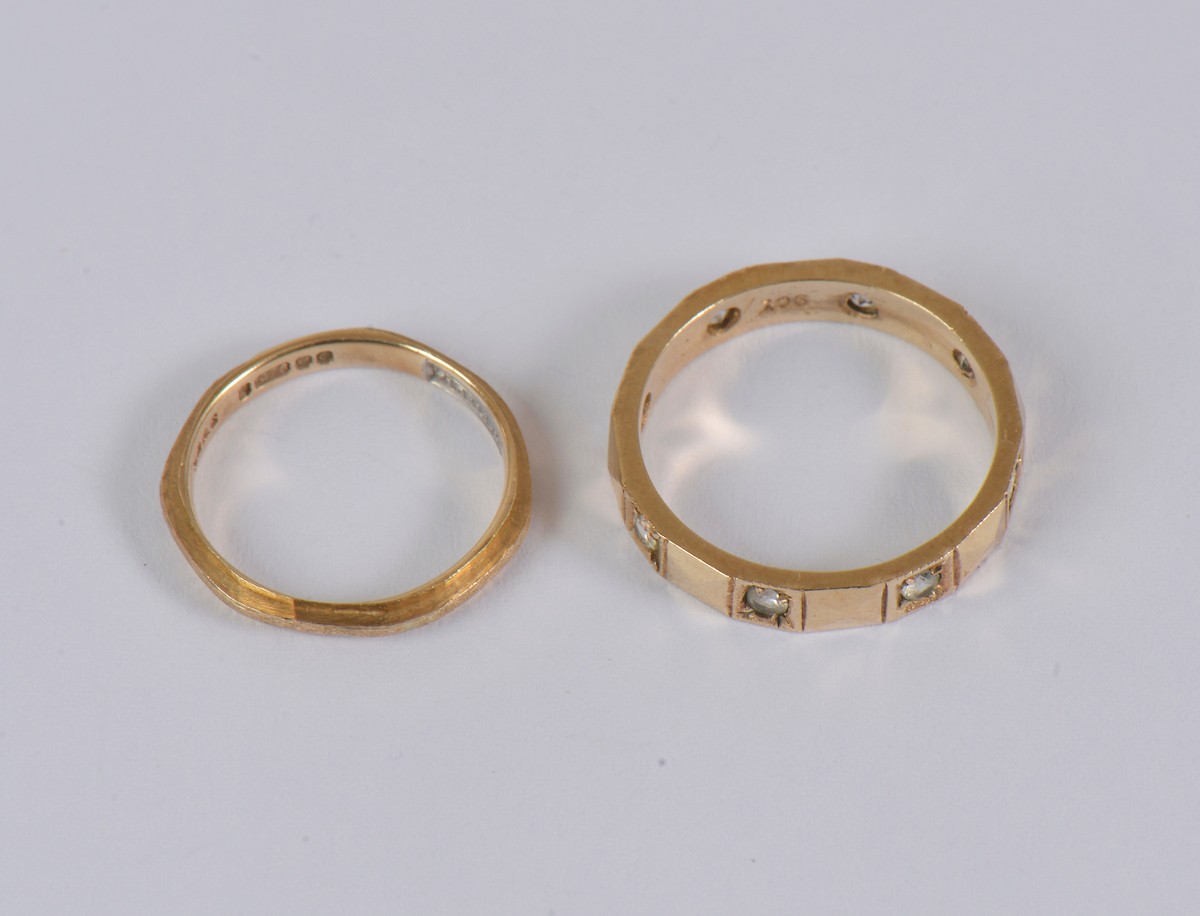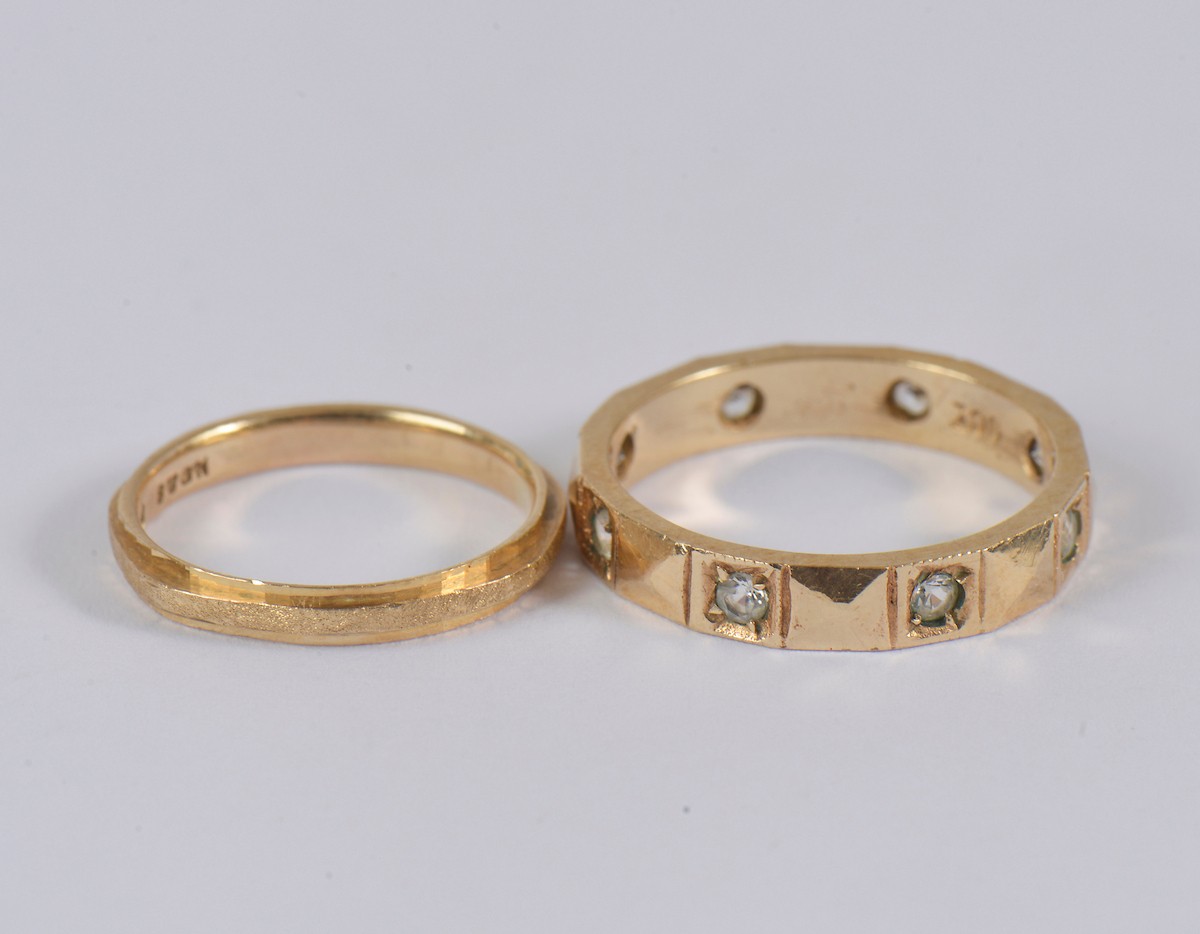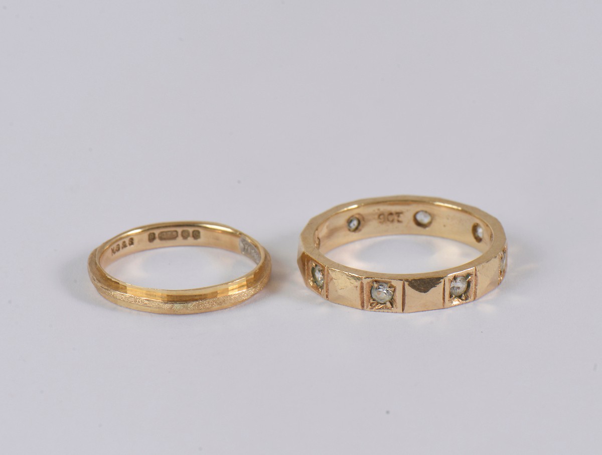 A ladies 9ct gold band (size H/I), paired together with a 9ct gold band set with paste stones (size M/N). Combined weight: 4.1g.