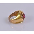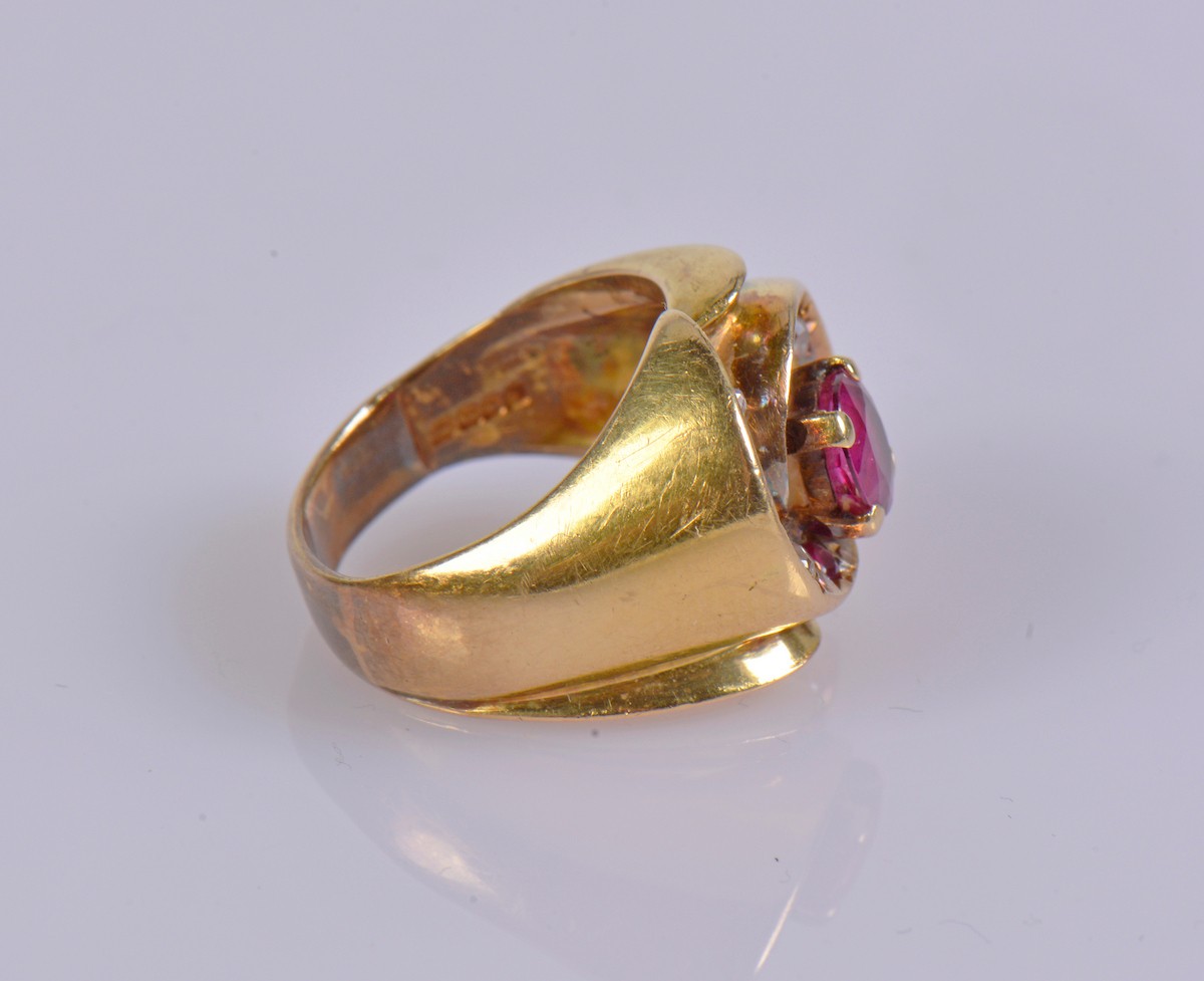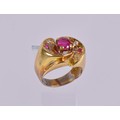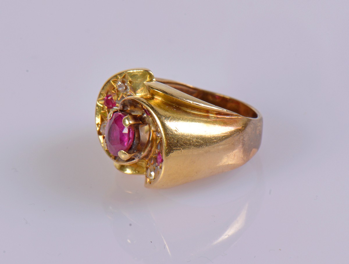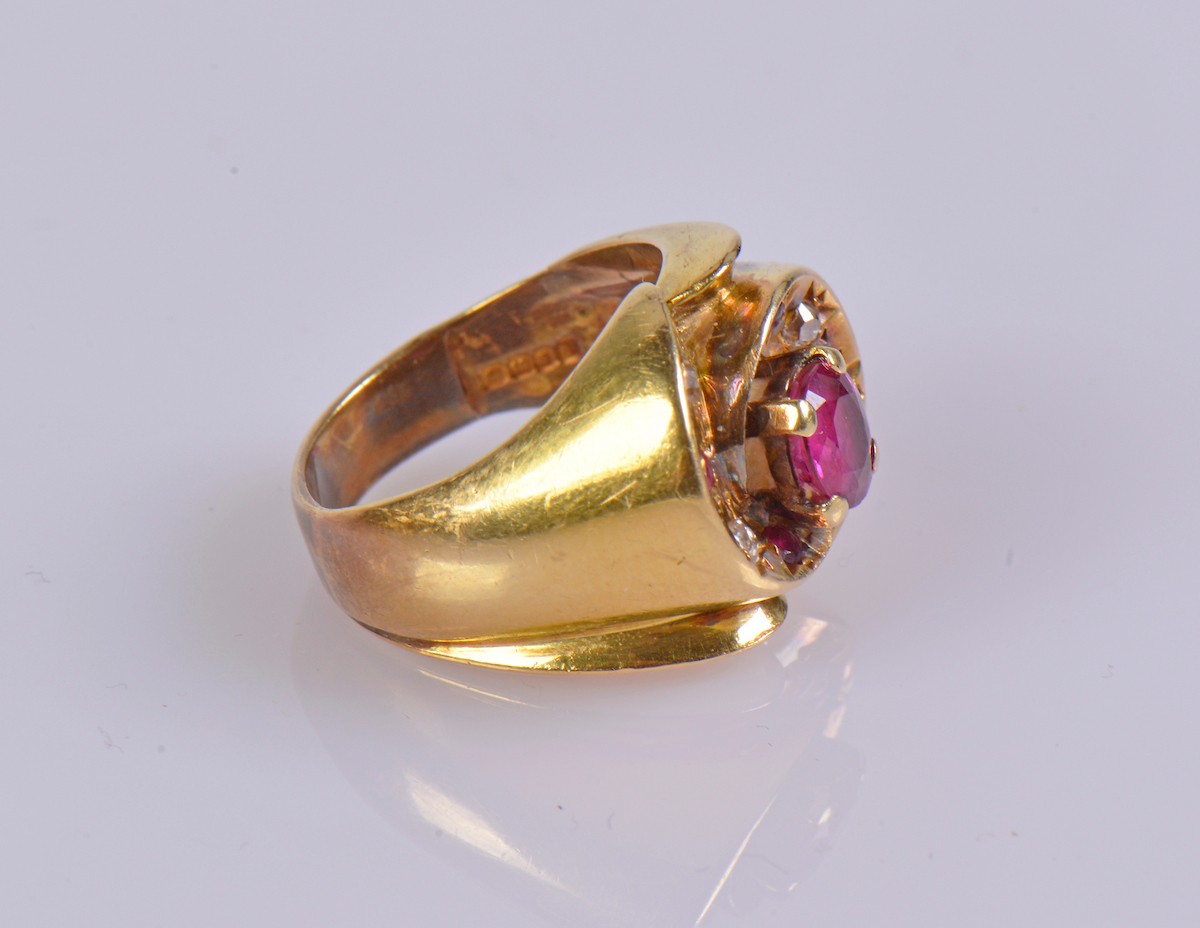 A RARE 18ct gold ring set with diamonds and rubies, (Possibly Kutchinsky) featuring a central ruby of approximately 0.75 ct. Weight approximately 10g. Ring size J/K. (Vendor has informed us it was possibly made by Joe Kutchinsky for his late sister).