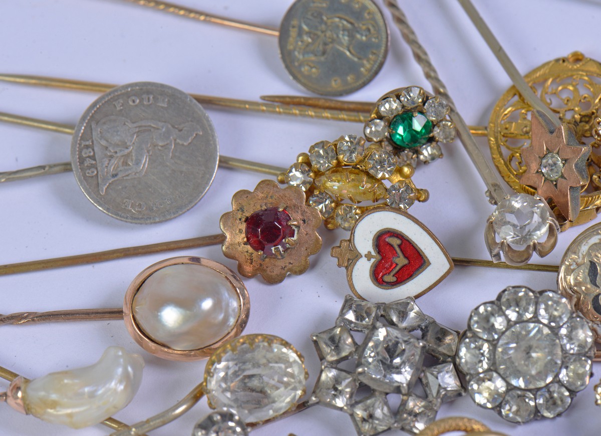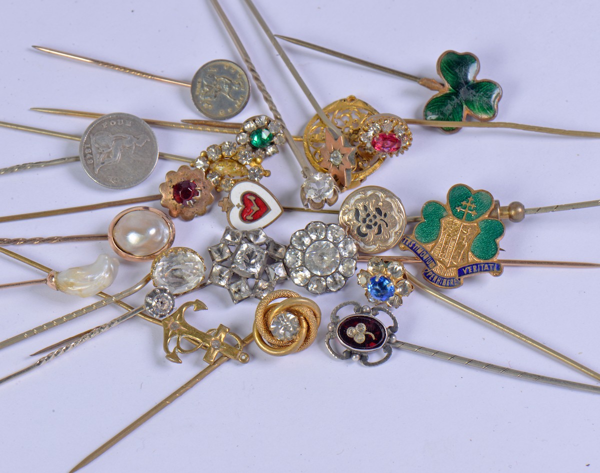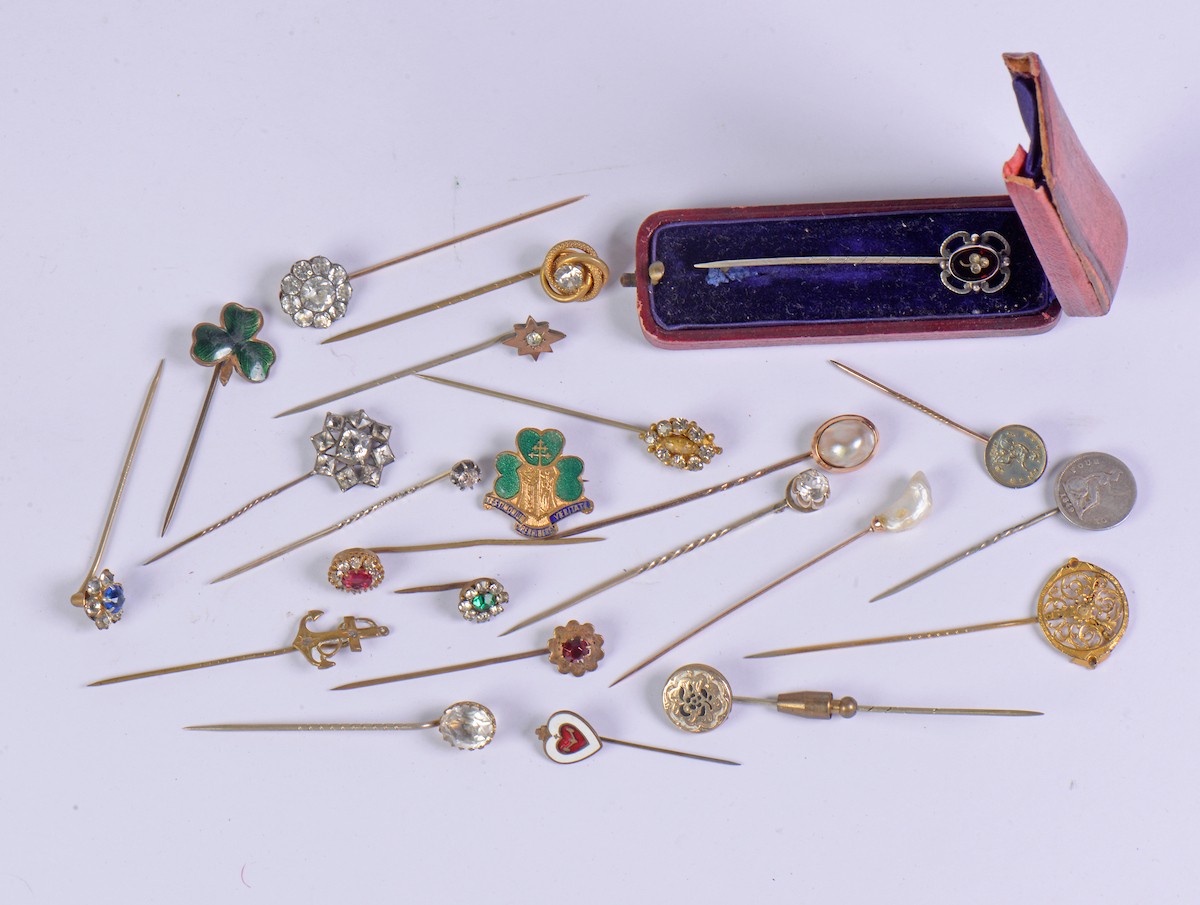 A charming collection of antique stick pins, including a green enamel clover pin, a pearl set pin, a ship’s anchor design, and several other interesting examples, some crafted in gold.