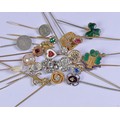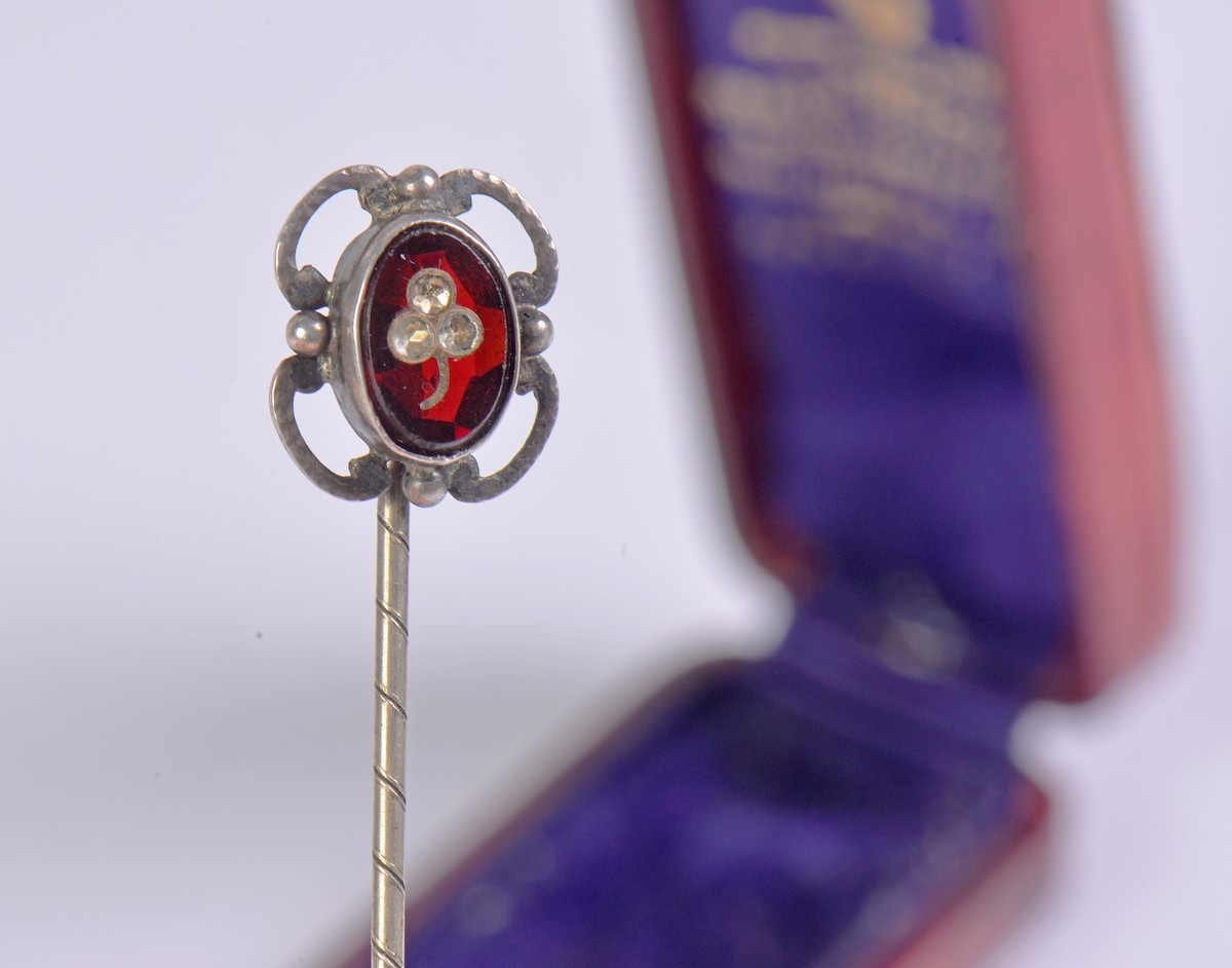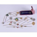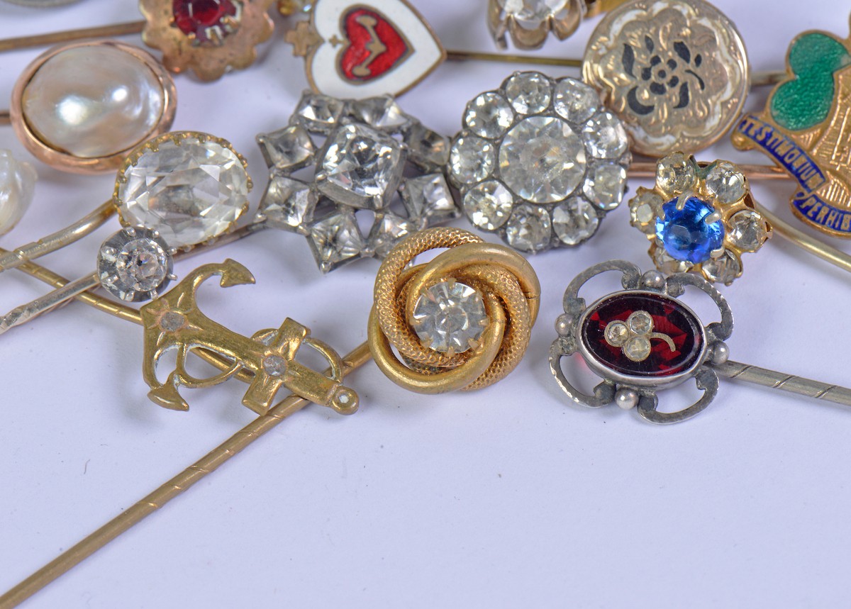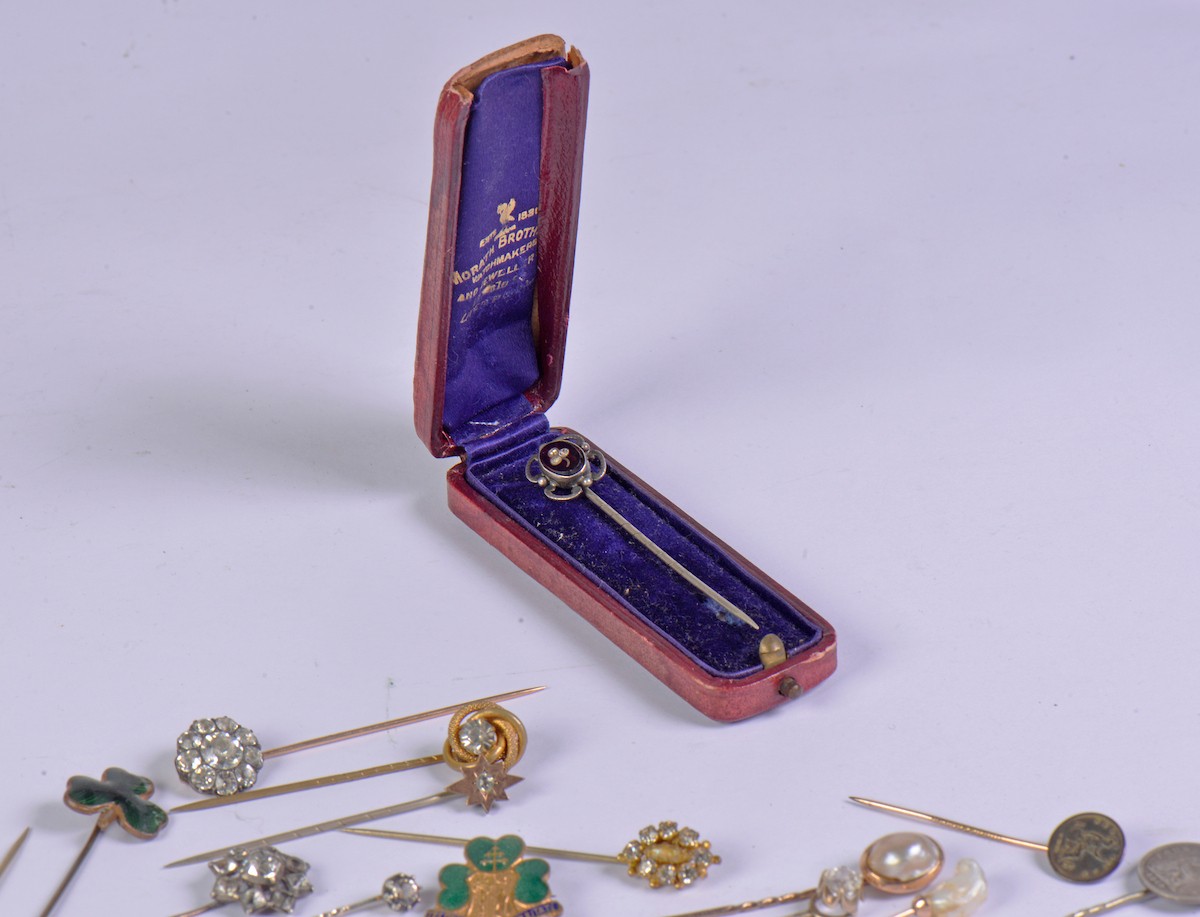 A charming collection of antique stick pins, including a green enamel clover pin, a pearl set pin, a ship’s anchor design, and several other interesting examples, some crafted in gold.